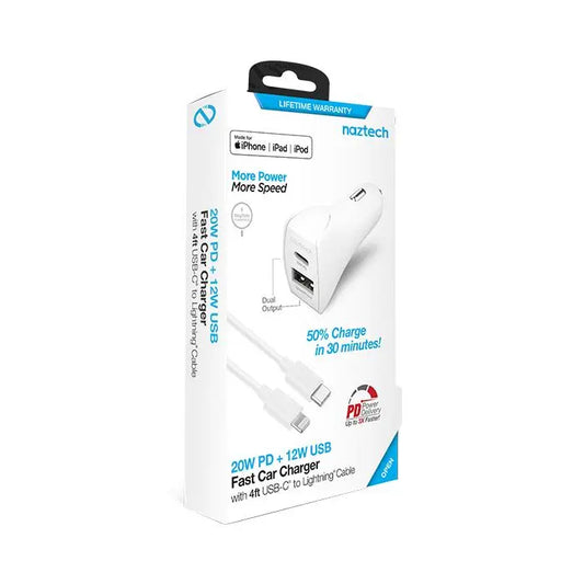 Naztech 20W PD + 12W USB Car Charger with 4 ft. Type-C to Lightning Cable