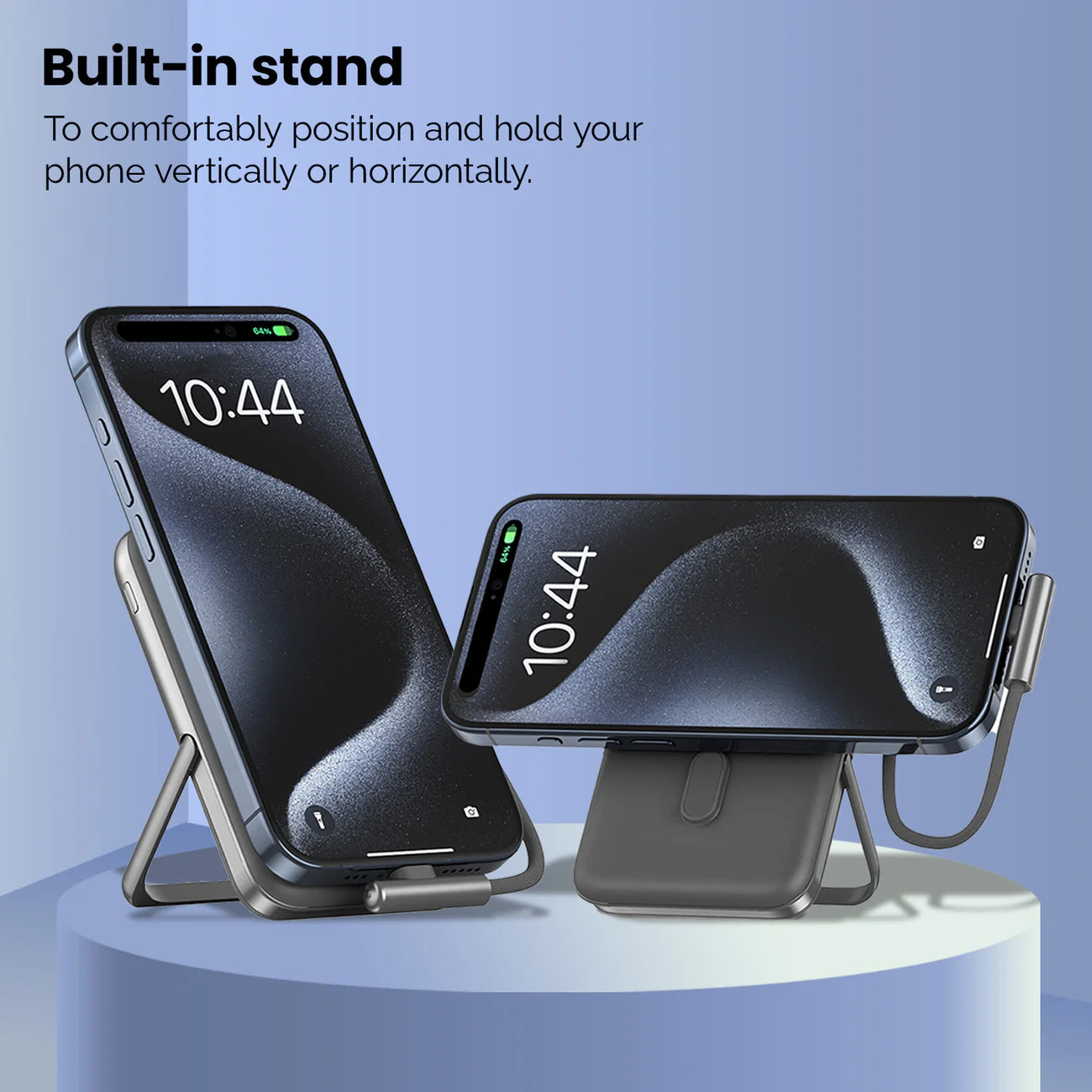 This power bank has a built-in Zinc Alloy stand to comfortably position and hold your phone horizontally so you can watch videos hands free, while it charges. The matt finish makes for a better grip and feels experience.